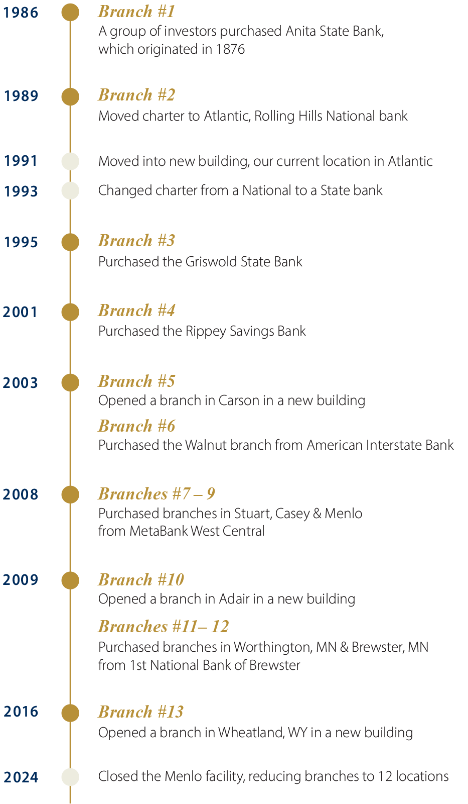 We take pride in our strong history, and you can be confident in our longevity and stability. First Financial Bank is a wholly-owned subsidiary of Anita Bancorporation. The Bank originated as the Anita State Bank, opening for business in July 1876. The Bank had various private owners over the years, surviving the Great Depression and the 1980€™s farm crisis. In 1989, the Bank changed its name to First Financial Bank and Trust and opened a second office in Atlantic, Iowa.